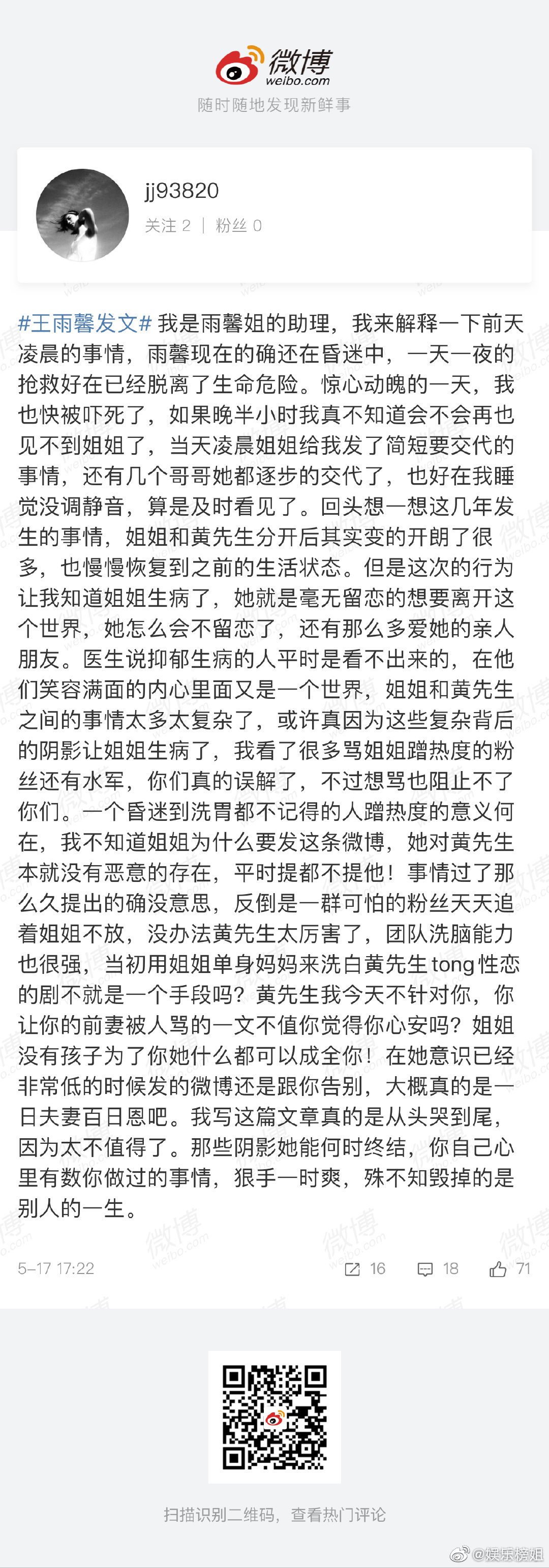 Không chỉ vậy, trợ lý của Vương Vũ Hinh cũng bày tỏ sự bức xúc của mình đối với "Hoàng tiên sinh", vì anh mà cuộc sống của Vương Vũ Hinh đã thay đổi theo hướng tiêu cực. Dù không nói tên nhưng dân mạng đều chắc chắn "người đàn ông" trong lời nói của Vương Vũ Hinh và "Hoàng tiên sinh" kia là đang nói đến Hoàng Cảnh Du.