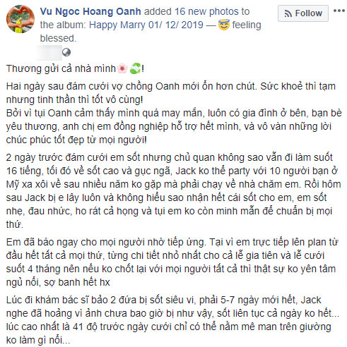 2 ngày sau khi hôn lễ kết thúc, mới đây Hoàng Oanh vừa đăng tải một dòng trạng thái khá dài lên trang cá nhân để chia sẻ về cảm xúc của mình trong ngày trọng đại và cũng là để cảm ơn gia đình, người thân và bạn bè thân thiết đã dốc sức hỗ trợ khi vợ chồng cô mệt lả vì ốm.