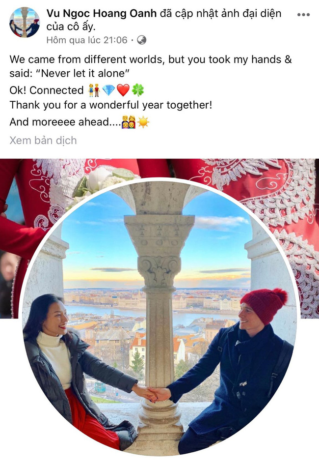 Đính kèm hình ảnh, Hoàng Oanh chia sẻ: "We came from different worlds, but you took my hands & said: "Never let it alone". Ok, connected. Thank you for a wonderful year together. And more ahead" (Tạm dịch: Chúng ta đến từ hai thế giới khác nhau, nhưng anh đã nắm lấy tay em và nói sẽ không bao giờ để em cô đơn. Ok, vậy là kết nối. Cảm ơn anh vì một năm tuyệt vời bên nhau. Và hơn thế nữa).