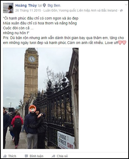 Trước đó, Hoàng Thùy đã liên tục khoe bạn trai trên facebook nhưng không cho mọi người thấy mặt anh chàng. |