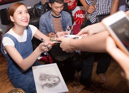 Hoàng Thùy Linh hạnh phúc khi được một fan tặng bức chân dung vẽ bằng bút chì. |