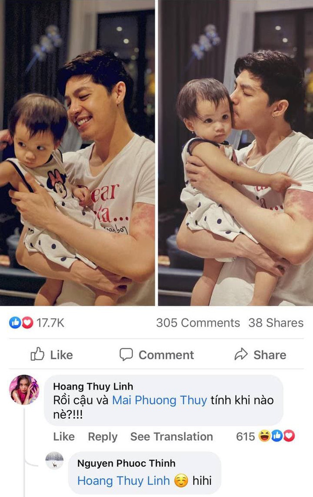 Tối ngày 10/1, Noo Phước Thịnh đã đăng tải lên trang cá nhân khoảnh khắc bế cháu đầy thành thục. Ngay lập tức, netizen liền vào bình luận mong nam ca sĩ sớm lập gia đình và có cho mình một thiên thần nhỏ đáng yêu như thế. Đáng chú ý, người bạn thân thiết của Noo Phước Thịnh là Hoàng Thuỳ Linh đã để lại câu hỏi liên quan trực tiếp đến Mai Phương Thuý như muốn nói đến chuyện em bé: "Rồi cậu và Mai Phương Thuý tính khi nào nè?". Giọng ca Thương Em Là Điều Anh Không Thể Ngờ dùng một biểu tượng mặt cười đầy bí ẩn thay cho câu trả lời.