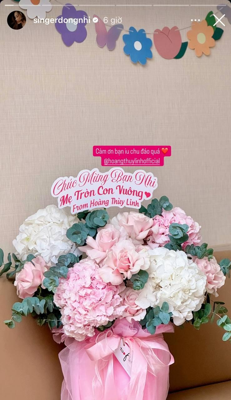 Dù không trực tiếp cập nhật thông tin mới nhưng Hoàng Thùy Linh đã xuất hiện thông qua bài đăng của Đông Nhi. Theo tiết lộ từ bà xã Ông Cao Thắng, Hoàng Thùy Linh dù không có mặt cùng hội bạn thân vào ngày cô "vượt cạn" nhưng đã gửi ngay một bó hoa lớn kèm lời nhắn: "Chúc mừng bạn Nhi mẹ tròn con vuông". Đông Nhi còn khen ngợi Hoàng Thùy Linh chu đáo và cảm ơn cô.