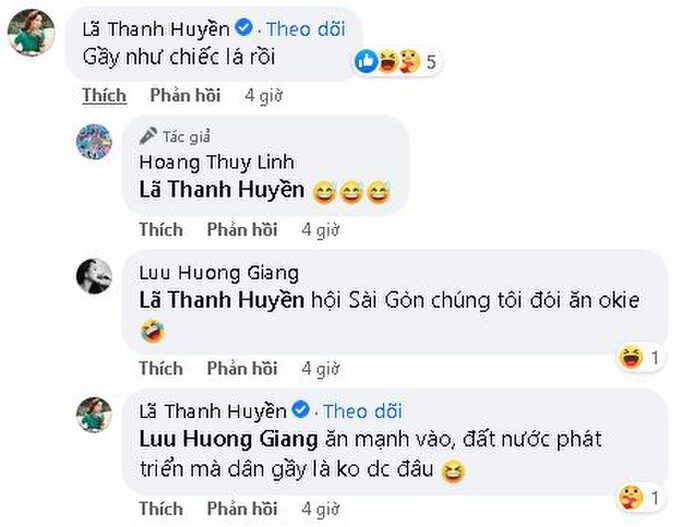 Sau khi xem loạt ảnh của nữ ca sĩ, diễn viên Lã Thanh Huyền lên tiếng nhắc nhở: "Gầy như chiếc lá rồi", ngay lập tức ca sĩ Lưu Hương Giang vào bênh vực: "Hội Sài Gòn chúng tôi đói ăn okie".