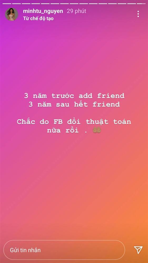 Vào năm 2021, Minh Tú từng gây chú ý khi đăng đàn ám chỉ ai đó âm thầm hủy kết bạn Facebook với cô. Trong khi 3 năm trước, chính người này chủ động kết bạn với nữ siêu mẫu. "3 năm trước add friend, 3 năm sau hết friend, chắc do Facebook đổi thuật toán rồi", Minh Tú viết.
