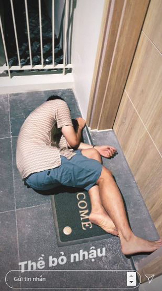Theo hình ảnh do chính nam ca sĩ chia sẻ, anh có vẻ như đã uống quá chén đến nỗi nằm bất tỉnh trước cửa phòng khách sạn, ở trong trạng thái không biết gì. Hẳn là một người bạn của Quang Vinh đã chụp lại được khoảnh khắc chuếnh choáng này và cho anh xem lại. Đến đây, "Hoàng tử sơn ca" chỉ biết thốt lên: "Thề bỏ nhậu".