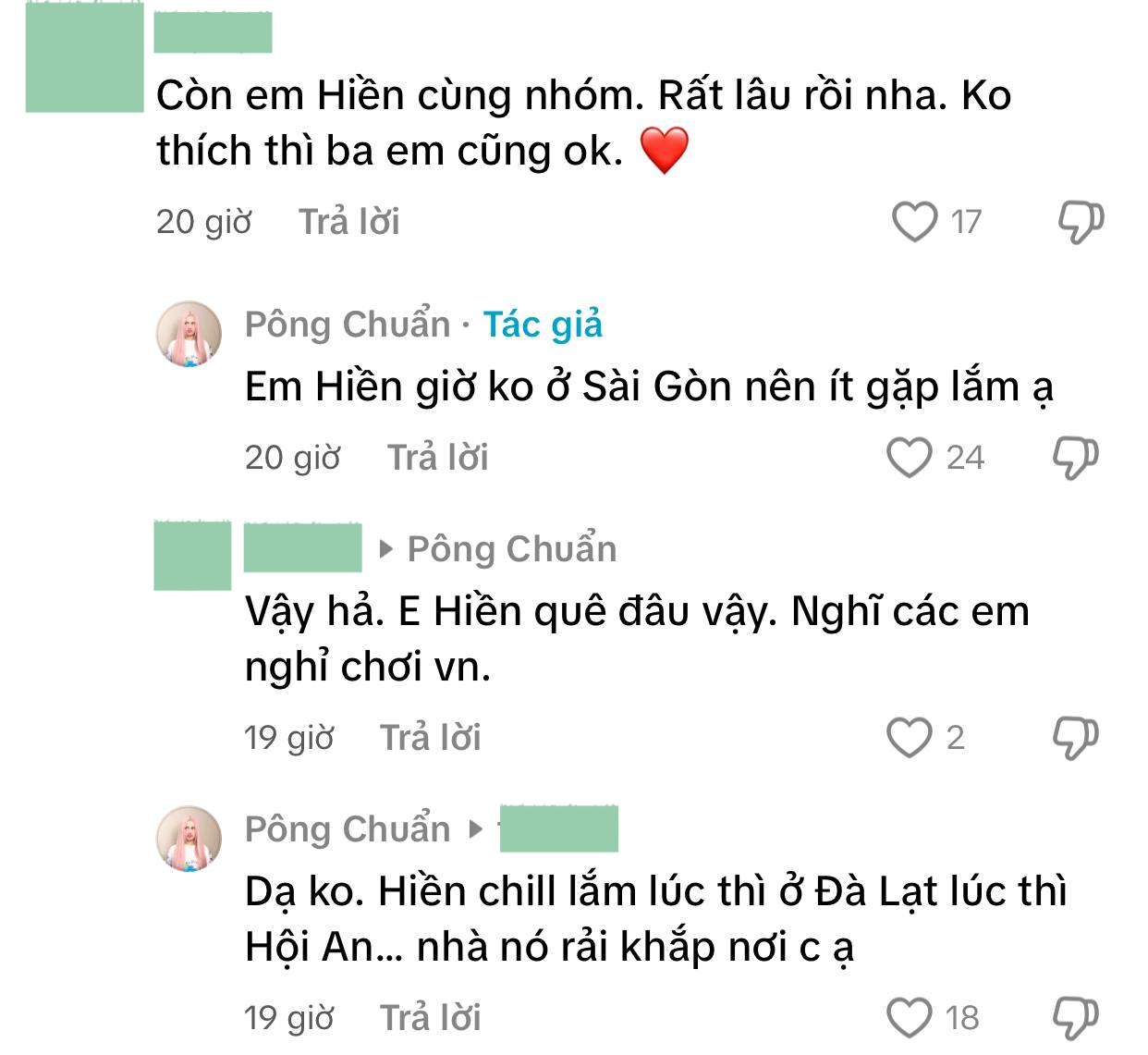 Ngay lập tức, Pông Chuẩn đã đích thân phản hồi để làm rõ: "Em Hiền giờ không ở Sài Gòn nên ít gặp lắm ạ". Khi tiếp tục được hỏi thêm về lý do, cô cũng chia sẻ thêm rằng Trần Hiền là người khá "chill", thường xuyên di chuyển giữa nhiều nơi như Đà Lạt, Hội An vì "nhà nó rải khắp nơi". Câu trả lời này phần nào cho thấy sự vắng mặt là do lịch trình cá nhân, chứ không xuất phát từ mâu thuẫn nội bộ.