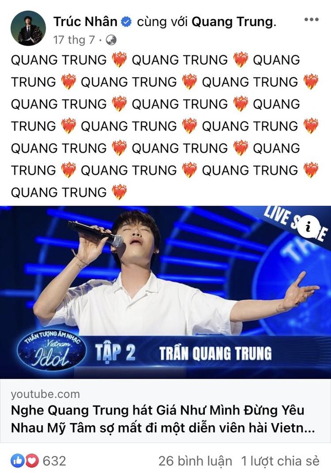 Vừa qua, Trúc Nhân đã chia sẻ trên trang cá nhân bài đăng cổ vũ Quang Trung tại chương trình Vietnam Idol 2023. Không viết những lời khen có cánh nhưng dòng trạng thái của anh chàng khiến ai cũng nhận ra rằng, giọng ca Có Không Giữ Mất Đừng Tìm đang rất phấn khích và tích cực ủng hộ anh bạn thân.