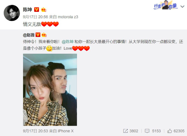 Có lần, Triệu Vy đăng hình ảnh selfie bên tài tử họ Trần cùng lời nhắn ngọt ngào: "Tớ tới thăm cậu đây. Cùng cậu trưởng thành là điều hạnh phúc nhất. Từ thời học đại học đến giờ cậu vẫn chẳng thay đổi gì cả, vẫn là một cậu nhóc. Cố lên nhé. Yêu cậu". Sau đó, Trần Khôn đã chia sẻ bài viết cùng bình luận: "Tình nghĩa bất bại".