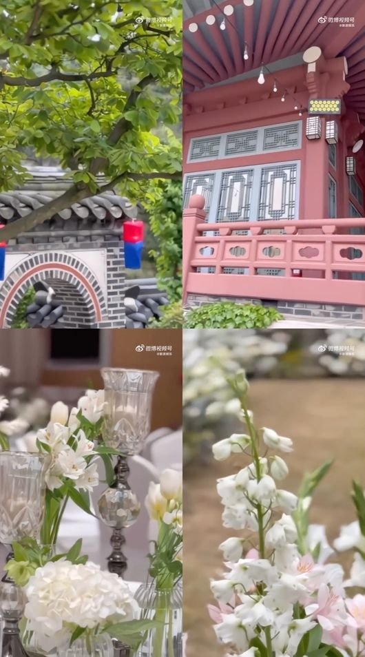 Lễ đường được trang trí bằng hoa tươi và đèn vàng, gợi nên cảm giác riêng tư và đầm ấm