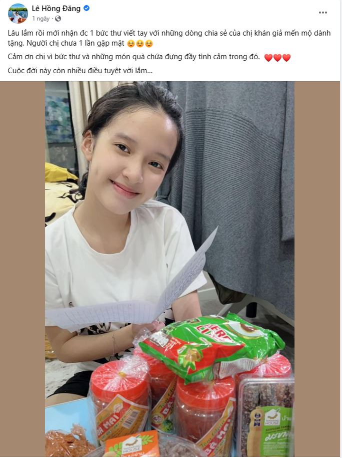 Hồng Đăng không giấu được sự xúc động: "Lâu lắm rồi mới nhận được một bức thư viết tay với những dòng chia sẻ của chị khán giả mến mộ dành tặng. Người chị chưa một lần gặp mặt.
