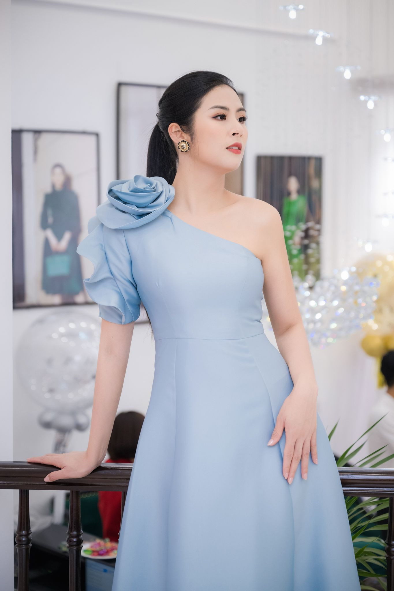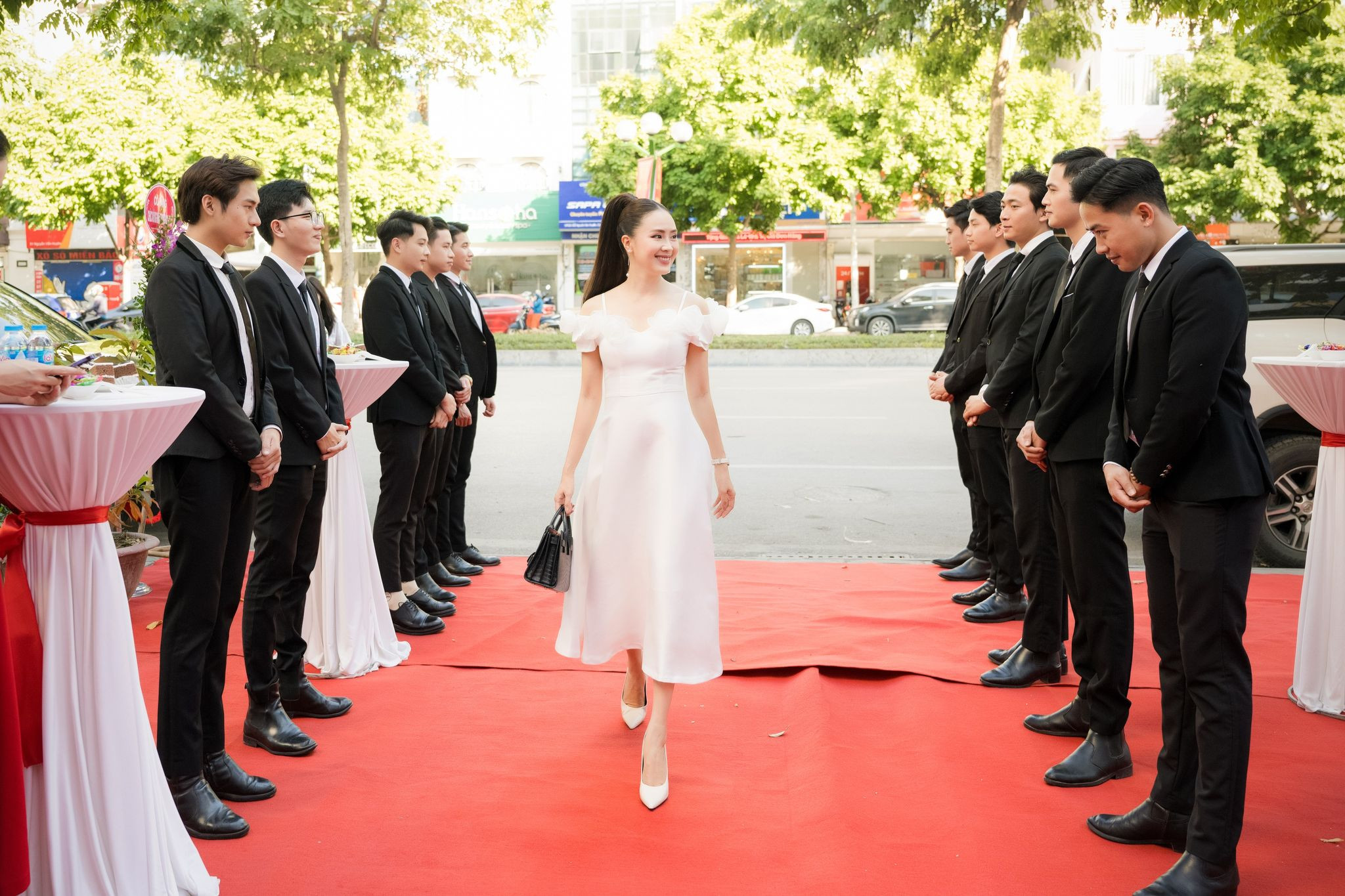 Với bộ đầm cocktail màu trắng dáng chữ A cổ điển, có điểm nhấn những bông hoa 3D trên vai, Hồng Diễm toát lên vẻ nhẹ nhàng như tiểu thư. Nữ diễn viên mix cùng giày trắng, xách túi hiệu đen có màu đối lập, đồng thời chọn layout make-up trong suốt cùng mái tóc buộc đuôi ngựa để tôn lên gương mặt khả ái.