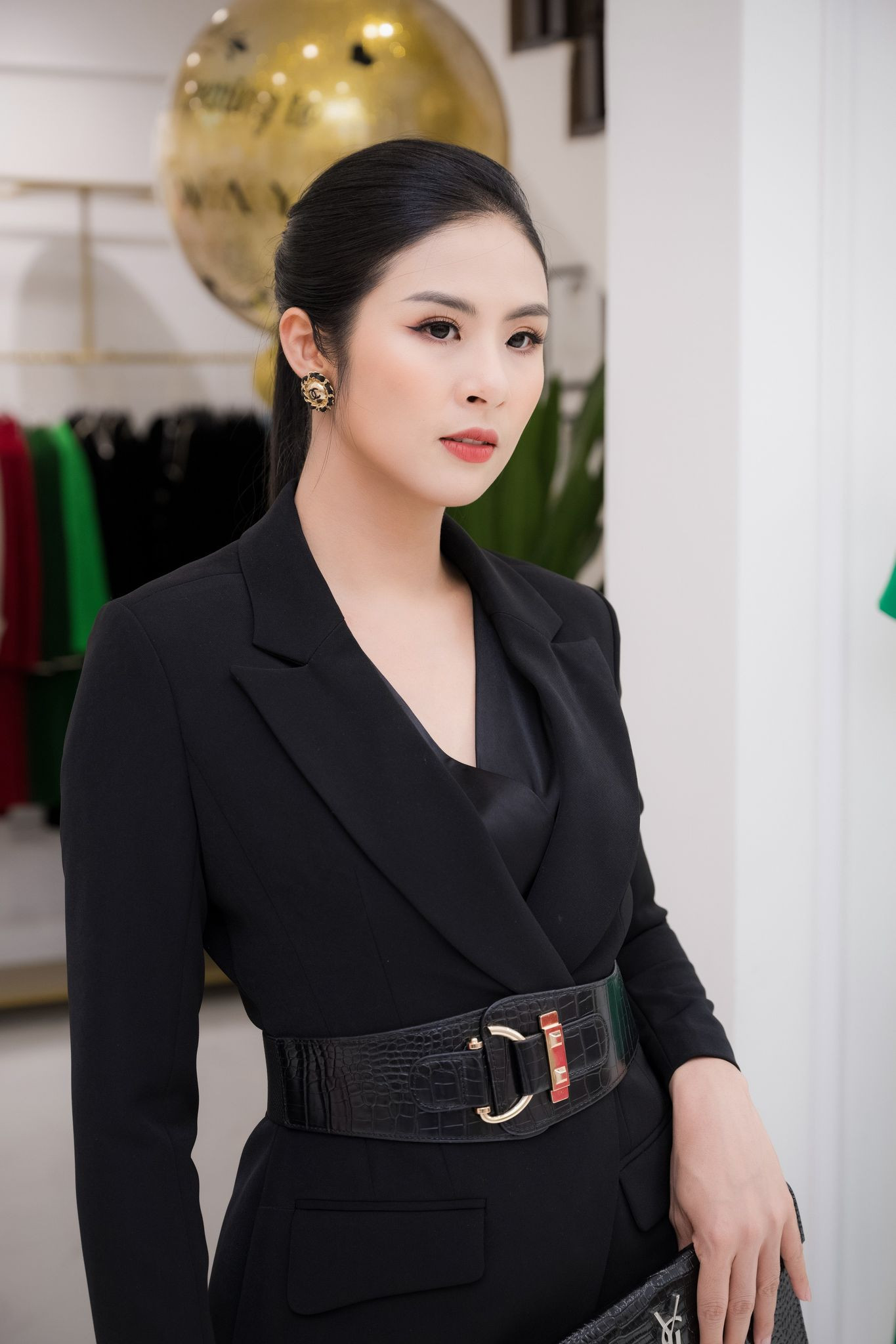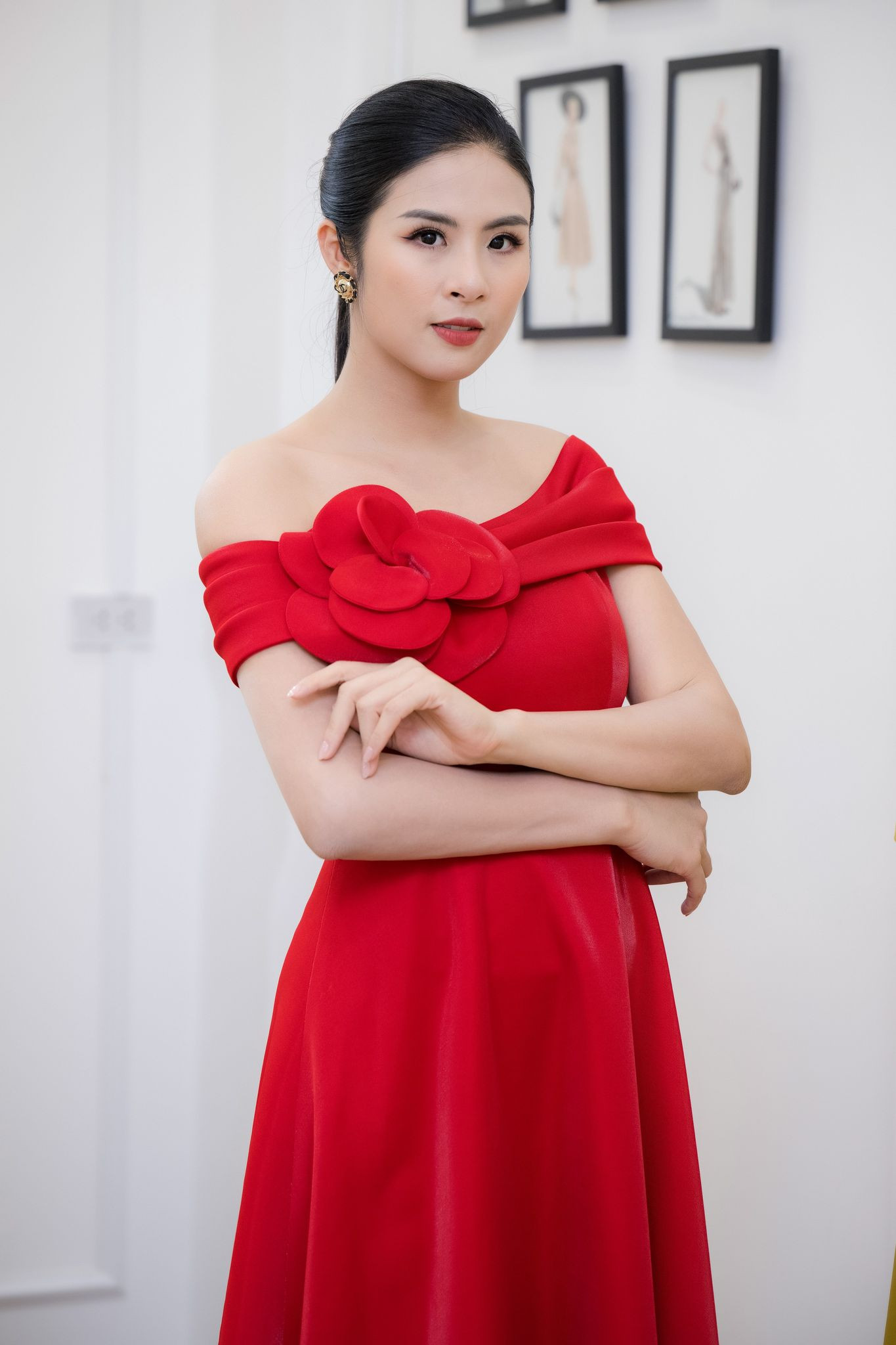 Hoa hậu Ngọc Hân cũng không kém cạnh khi biến hóa với nhiều set đồ khác nhau. Người đẹp thay hẳn 4 bộ đồ thanh lịch, có phom dáng cổ điển châu Âu, từ váy trễ vai đỏ, set tweet trắng, đầm cocktai lệch vai gợi cảm và set áo blazer - chân váy xếp ly tông đen.