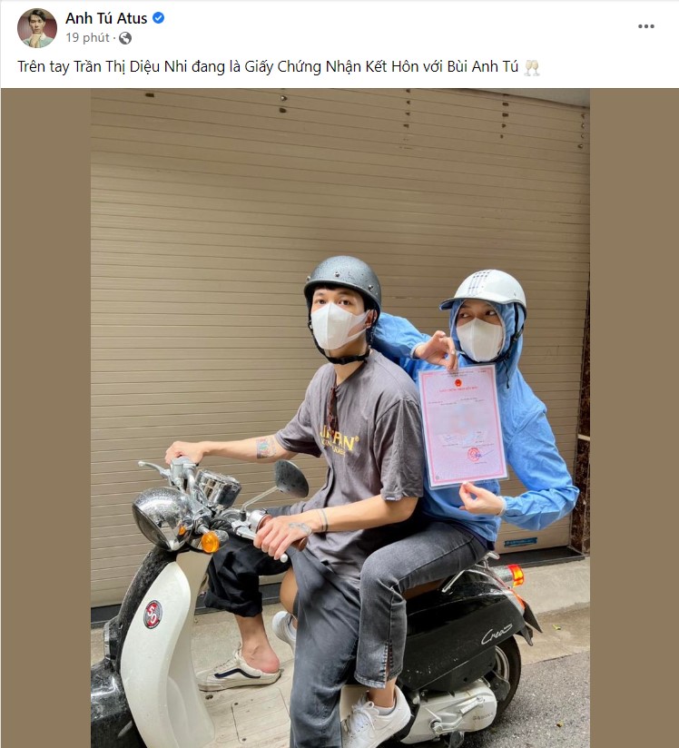 "Trên tay Trần Thị Diệu Nhi đang là Giấy Chứng Nhận Kết Hôn với Bùi Anh Tú", trai đẹp sinh năm 1993 viết.