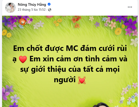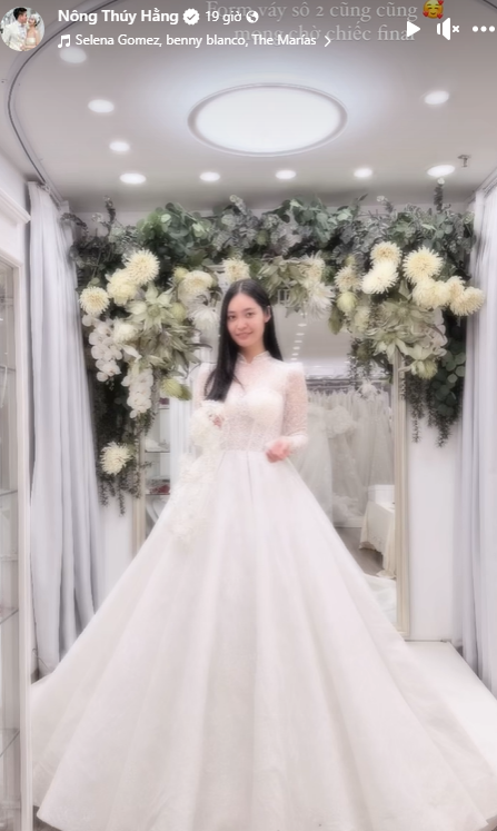 Mới đây, Hoa hậu Nông Thúy Hằng liên tục chia sẻ story đi mặc thử váy cưới trên trang cá nhân. Cô bày tỏ sự hào hứng: "Thử form váy chưa đính kết gì mà trông xinh thế nhỉ". Vào cuối tháng 5 vừa qua, người đẹp 9x cũng thông báo đã tìm được MC cho hôn lễ: "Em chốt được MC đám cưới rồi ạ. Em xin cảm ơn tình cảm và sự giới thiệu của tất cả mọi người".