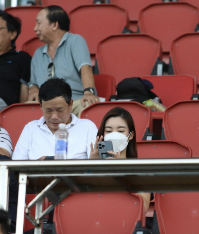 Cụ thể, một trong những vị khách đáng chú ý nhất trên sân Hoà Xuân là Hoa hậu Đỗ Mỹ Linh. Càng thú vị khi Đỗ Mỹ Linh công khai ngồi bên cạnh con trai bầu Hiển và cả hai cùng diện đồ đen.