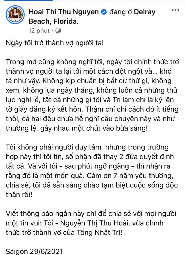 Tôi không phải người duy tâm, nhưng trong trường hợp này thì tôi tin, số phận đã thay 2 đứa quyết định tất cả. Và với tôi - sau phút ngỡ ngàng - thì nhận ra rằng đó là một món quà. Cảm ơn 7 năm yêu thương, chia sẻ, tôi đã sẵn sàng chào tạm biệt cuộc sống độc thân rồi! Viết thông báo ngắn này chỉ để chia sẻ với mọi người một tin vui: Tôi - Nguyễn Thị Thu Hoài, vừa chính thức trở thành vợ của Tống Nhật Trí!".