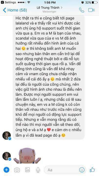 Mọi chuyện tưởng như đã chìm vào quá khứ nhưng mới đây, Sơn Ngọc Minh bất ngờ tung loạt tin nhắn được cho là của anh cùng với Erik và tố đàn em lợi dụng mình rồi bỏ. Trong tin nhắn có thể thấy, Sơn Ngọc Minh muốn níu kéo nhưng Erik muốn tập trung cho sự nghiệp và không muốn để chuyện tình cảm ảnh hưởng đến công việc.