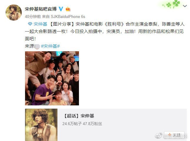 Mới đây, trên weibo đã bất ngờ đăng tin chia sẻ hình ảnh mới nhất của Song Joong Ki chỉ sau 1 tuần chia tay Song Hye Kyo.Theo đó, Song Joong Ki đã có buổi gặp gỡ với đoàn phim "Victory", bộ phim mới của anh sẽ mở máy vào thời gian tới.