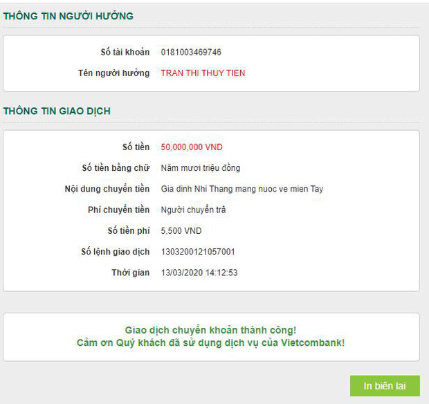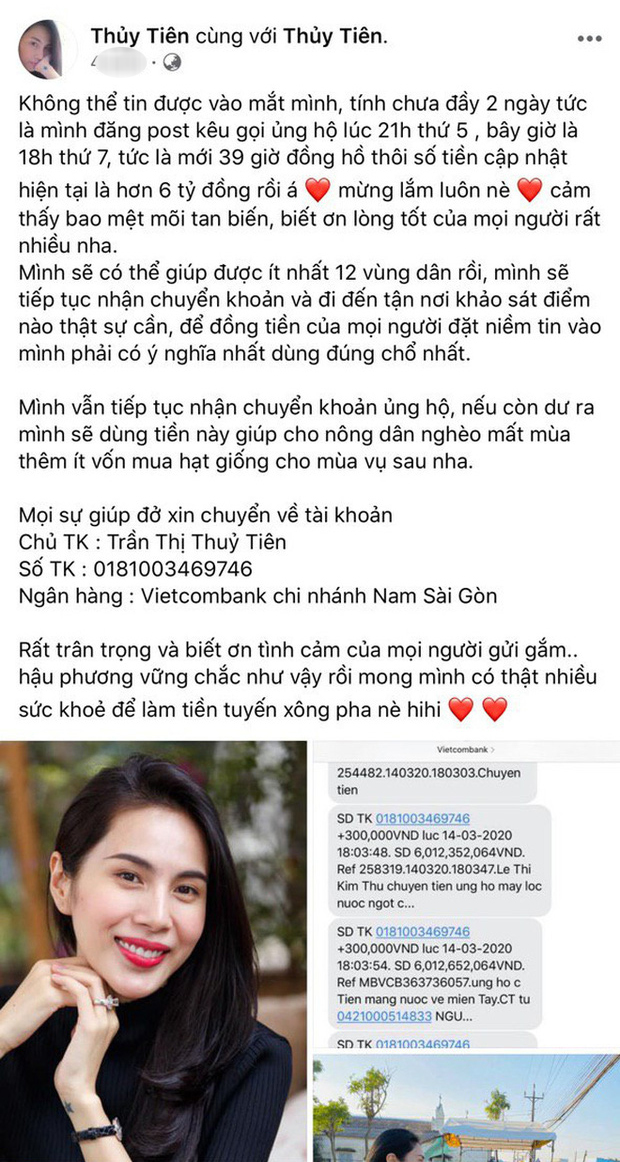Tối 14/3, Thủy Tiên gây bất ngờ cực độ khi thông báo rằng hiện tại cô đã nhận được 6 tỷ đồng sau 39 giờ kêu gọi ủng hộ trên trang cá nhân. Số tiền này được bà xã Công Vinh sử dụng để giúp 12 tỉnh có máy lọc nước ngọt trong những ngày tới. Bên dưới bài đăng của Thủy Tiên, vô số cư dân mạng đã thể hiện sự ủng hộ bằng cách liên tiếp gửi tiền vào tài khoản của cô, chứng tỏ họ hoàn toàn tin tưởng vào Thủy Tiên nói riêng và vợ chồng nữ ca sĩ nói chung.