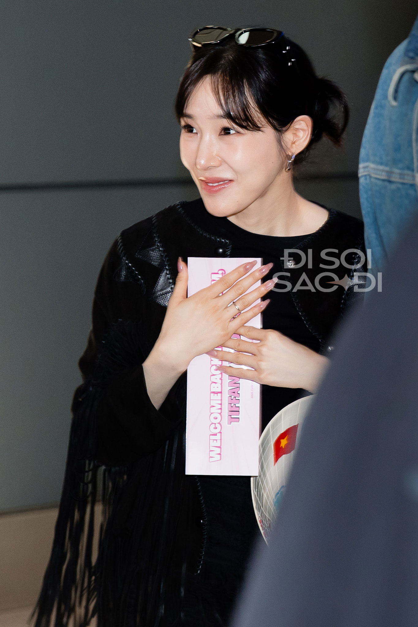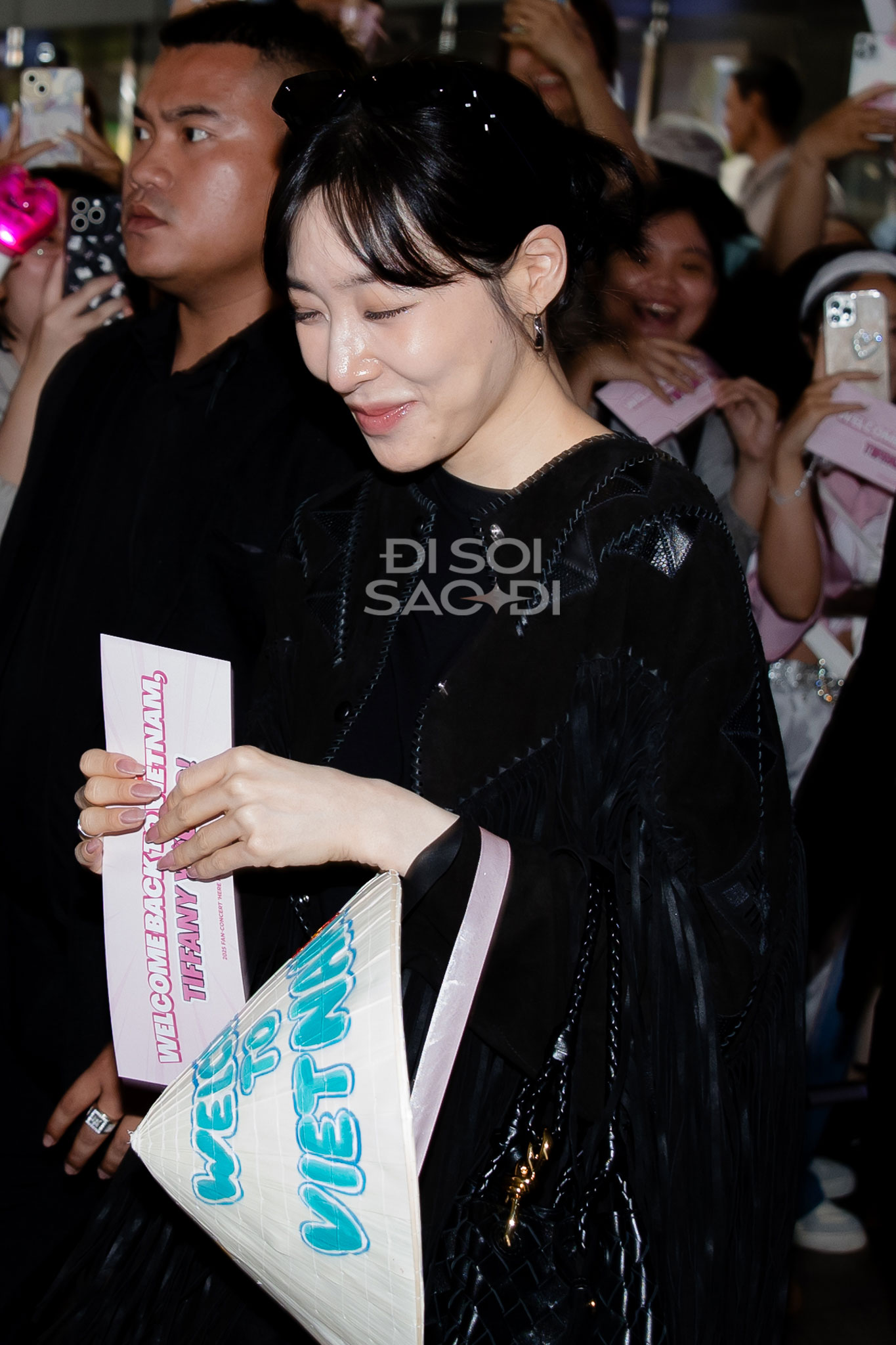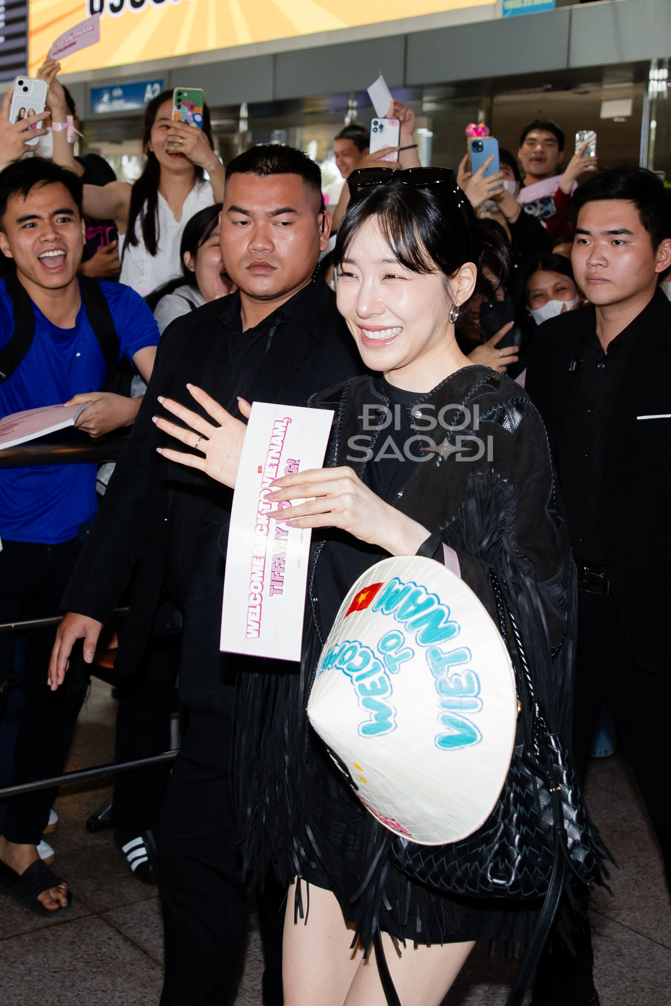 Dù hạ cánh sau chuyến bay dài nhưng mỹ nhân SNSD vẫn rất tươi tắn, xinh đẹp và giàu năng lượng. Tại sân bay, Tiffany xinh phát sáng nhờ làn da trắng, mái tóc đen cổ điển, gương mặt xinh đẹp "hack tuổi" và đặc biệt là đôi mắt cười đã thành thương hiệu. Nữ idol còn nhận chiếc nón lá fan tặng, thân thiện chào SONE Việt Nam trong ngày tái ngộ.