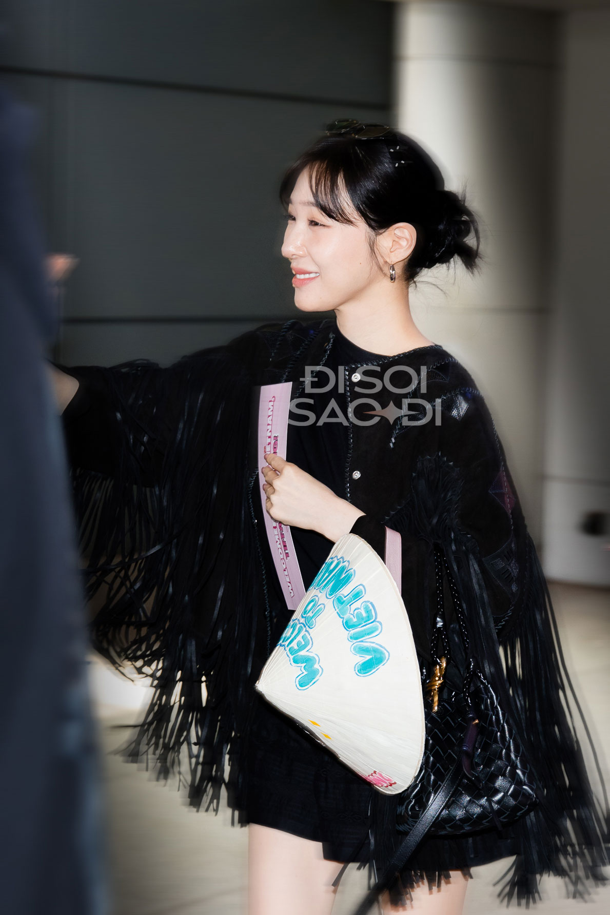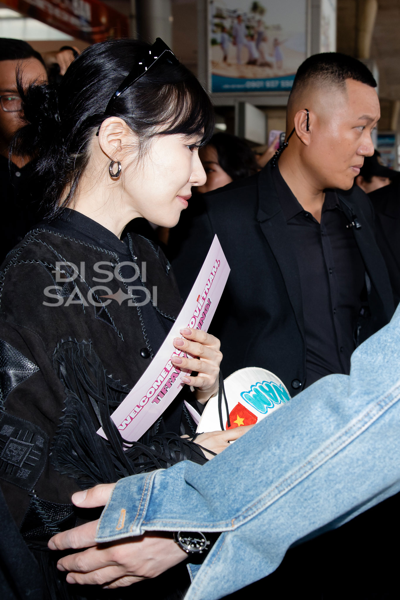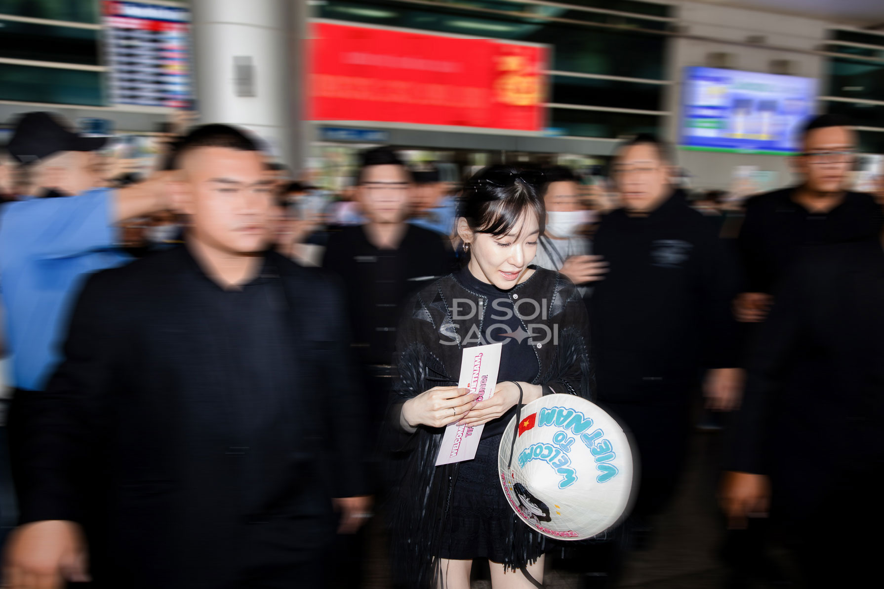 Dù hạ cánh sau chuyến bay dài nhưng mỹ nhân SNSD vẫn rất tươi tắn, xinh đẹp và giàu năng lượng. Tại sân bay, Tiffany xinh phát sáng nhờ làn da trắng, mái tóc đen cổ điển, gương mặt xinh đẹp "hack tuổi" và đặc biệt là đôi mắt cười đã thành thương hiệu. Nữ idol còn nhận chiếc nón lá fan tặng, thân thiện chào SONE Việt Nam trong ngày tái ngộ.