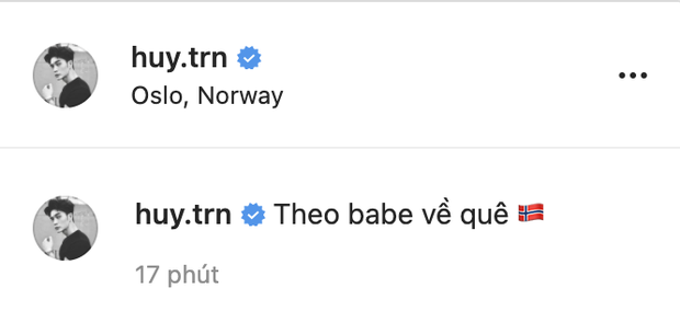 Trái ngược với những lần "che chắn" hình xăm, bôi mờ vụng về như trước, Huy Trần lần này đã chịu khó đăng luôn ảnh khoe trọn bàn tay của bạn gái Ngô Thanh Vân rồi. Tất nhiên là không quên một chút caption "sến súa": Theo babe về quê. Không khó để nhận ra biểu tượng lá cờ Na Uy và địa điểm Huy Trần check-in trên Instagram.