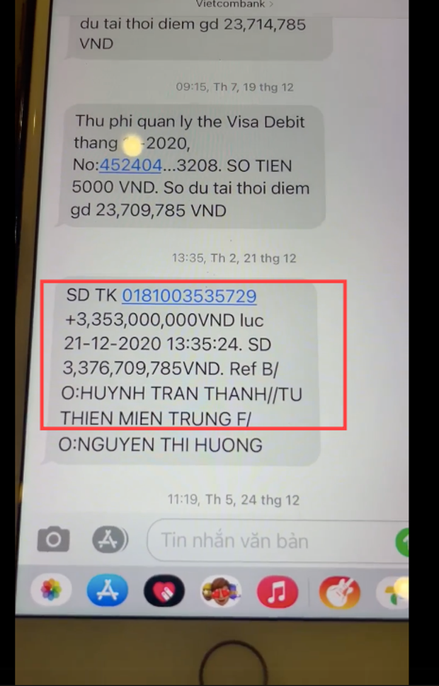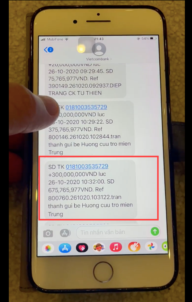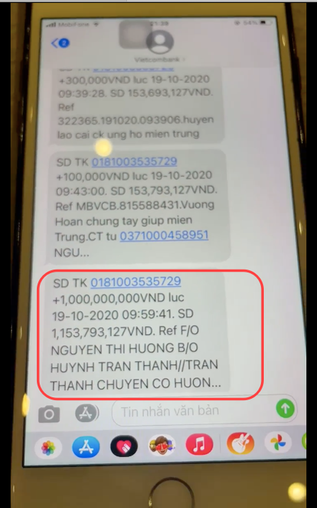 - Đợt 2: Lúc đó cô Ngọc Hương đang trực tiếp đi cứu trợ ngoài miền Trung, chưa nhận được hồi âm của Thuỷ Tiên, tôi đành quyết định chuyển gấp cho cô thêm 2.100.000.000đ (vì không ra được ngân hàng nên tôi phải chuyển khoản bằng mobile banking 300.000.000đ / lần. Chuyển đúng 7 lần là 2.100.000.000đ. Tôi sẽ in sao kê, có ghi rõ nội dung chuyển rõ ràng cho quý vị xem)