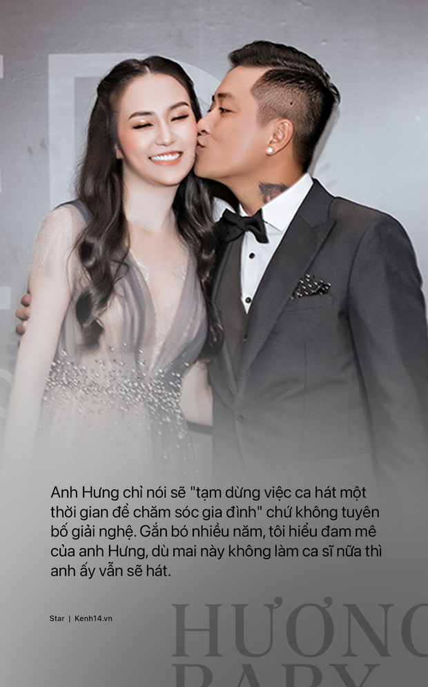 Trước tiên, tôi thay mặt anh Hưng gửi lời cảm ơn đến khán giả vì đã luôn quan tâm đến con đường ca hát của anh ấy. Đó là niềm hạnh phúc lớn nhất đối với mỗi người nghệ sĩ. Là một người vợ, tôi ủng hộ mọi quyết định của chồng mình. Hơn nữa, anh Hưng chỉ nói sẽ "tạm dừng việc ca hát một thời gian để chăm sóc gia đình" chứ không tuyên bố giải nghệ. Gắn bó nhiều năm nên tôi hiểu đam mê của anh Hưng, dù mai này không làm ca sĩ nữa thì anh ấy vẫn sẽ hát. Sự nhiệt huyết ấy chính là điều mà tôi luôn nhìn vào và học tập ở chồng.