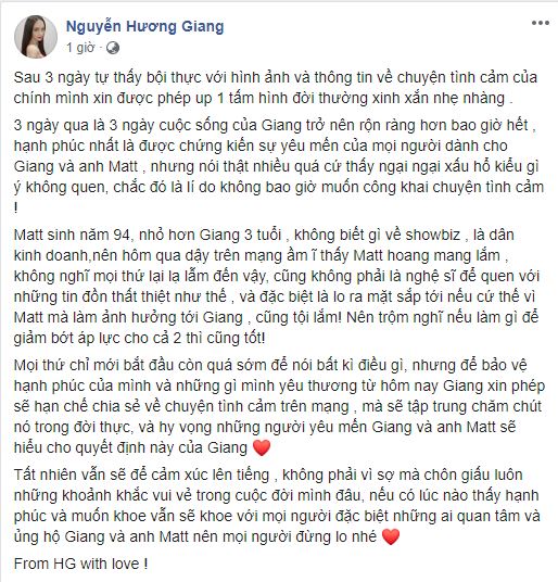 Mọi thứ chỉ mới bắt đầu còn quá sớm để nói bất kì điều gì nhưng để bảo vệ hạnh phúc của mình và những gì mình yêu thương, từ hôm nay Giang xin phép sẽ hạn chế chia sẻ về chuyện tình cảm trên mạng, sẽ tập trung chăm chút nó trong đời thực và hy vọng những người yêu mến Giang và anh Matt sẽ hiểu cho quyết định này của Giang.