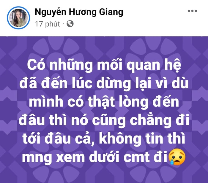 17/07/2022 15:25Hương Giang đăng bài đầy ẩn ý: 'Có những mối quan hệ đến lúc phải dừng lại', nghi vấn sắp 'toang'?