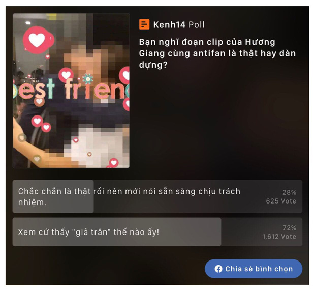 Qua một cuộc khảo sát gần đây, số lượng người "ngờ ngợ" về độ chân thật khi xem clip Hương Giang cùng antifan lên tới 72%, hoàn toàn áp đảo bình chọn còn lại.