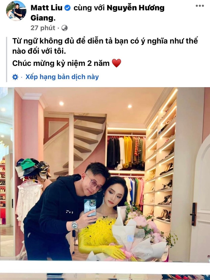 Về phía nhà trai, Matt Liu cũng đăng tải bức ảnh cả hai kèm lời nhắn "ngọt như mía lùi". Nam CEO viết: "Từ ngữ không đủ để diễn tả bạn có ý nghĩa như thế nào đối với tôi. Chúc mừng kỷ niệm 2 năm".