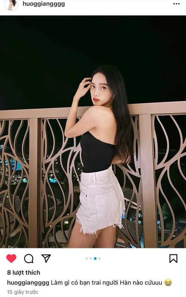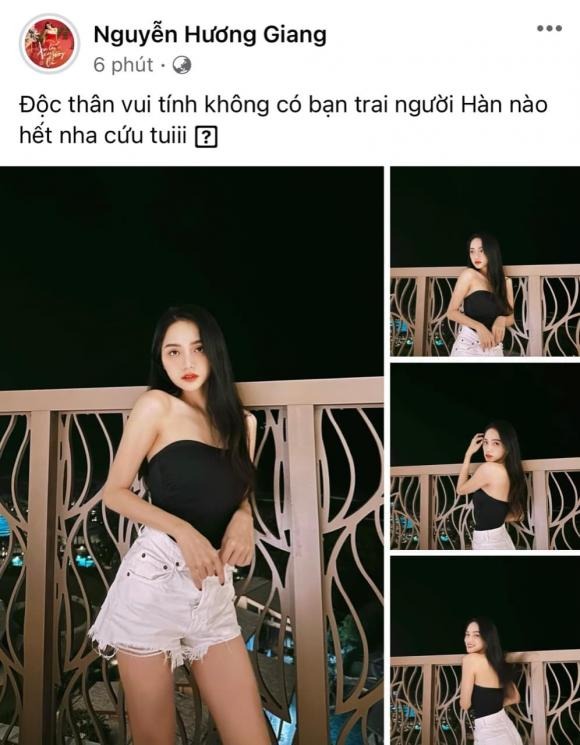 Cho đến tối 11/1, giữa lúc tin đồn có tình mới đang rầm rộ, Hương Giang đã đăng tải loạt ảnh khoe sắc vóc đáng ngưỡng mộ lên trang Instagram cá nhân, kèm theo đó là dòng trạng thái phủ nhận chuyện hẹn hò với nam người mẫu xứ củ sâm: "Làm gì có bạn trai người Hàn nào, cứu". Trên Facebook, người đẹp cũng có động thái tương tự: "Độc thân vui tính không có bạn trai người Hàn nào hết nhà, cứu tui".