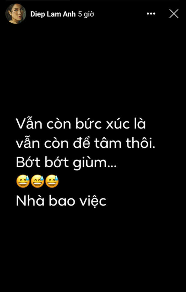 Cách đây ít giờ, Diệp Lâm Anh vừa đăng tải dòng trạng thái lạ lên Instagram cá nhân: "Vẫn còn bức xúc là vẫn còn để tâm thôi! Bớt bớt giùm! Nhà bao việc!".