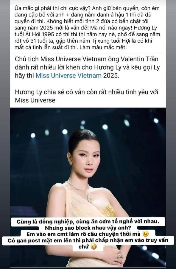 Hương Ly sau đó đã đăng tải hình ảnh bài viết của netizen này trên trang cá nhân và có động thái cực gắt: "Cùng là đồng nghiệp, cùng ăn cơm Tổ nghề với nhau mà sao block nhau vậy anh. Em vào bình luận làm rõ câu chuyện thôi mà. Có gan đăng mặt em lên thì phải chấp nhận em vào truy vấn chứ". Sau khi bị Hương Ly đáp trả cực căng trên trang cá nhân, người này đã che mặt cô lại tuy nhiên vẫn để rõ tên Hương Ly. Ở story tiếp theo, Á hậu 1 Miss Universe Vietnam thậm chí còn thoải mái đăng tải đoạn video trò chuyện với ông Valentin Trần - Chủ tịch của cuộc thi Miss Universe Vietnam. Kèm theo đó, Hương Lý còn viết dòng chú thích hài hước: "Đưa tay đây nào, mãi bên nhau bạn nhé".