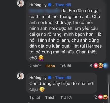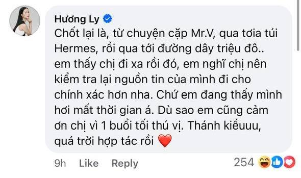 Hương Ly sau đó cũng có động thái đáp trả: "Chốt lại là từ chuyện cặp Mr.V, qua tới túi Hermes, rồi qua tới đường dây triệu đô. Em thấy chị đi xa rồi đó, em nghĩ chị nên kiểm tra lại nguồn tin của mình đi cho chính xác hơn nha. Chứ em đang thấy mình hơi mất thời gian. Dù sao em cũng cảm ơn chị vì 1 buổi tối thú vị. Quá trời hợp tác rồi". Cô còn thẳng thắn yêu cầu người này hãy tung ra bằng chứng minh bạch về hình ảnh, chứ không nên tung tin dẫn dắt dư luận.