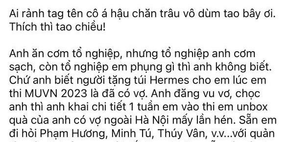 Người này sau đó còn tiếp tục đăng tải bài viết tố cô có mối quan hệ ngoài luồng với người đã có gia đình, được tặng đồ hiệu xa xỉ từ thương hiệu lớn trên thế giới: "Anh ăn cơm tổ nghiệp nhưng tổ nghiệp anh cơm sạch, còn tổ nghiệp em phụng gì thì anh không biết. Chứ anh biết người tặng túi Hermes cho em lúc thi MUVN 2023 là đã có vợ. Anh đăng vu vơ, chọc anh thì anh khai chi tiết 1 tuần em vào thi em unbox quà của anh có vợ ngoài Hà Nội mấy lần".