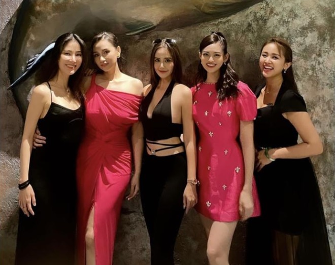 Dress code chủ đạo trong bữa tiệc là màu hồng đen sang trọng. Ai nấy đều lên đồ cực sang chảnh, Huyền Lizzie diện out fit màu đen với chiếc đầm cắt xẻ táo bạo, Lã Thanh Huyền khéo léo khoe vai trần với chiếc đầm màu hồng nổi bật.
