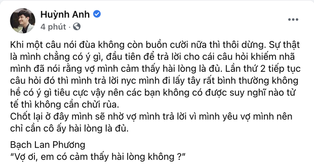 Đến sáng ngày 9/9, Huỳnh Anh chính thức lên tiếng về sự việc này trên trang cá nhân. Anh viết: "Xoá cái bài đăng hôm qua vì có những suy nghĩ về bình luận của mình theo hướng tiêu cực rồi chửi rủa trong khi câu nói của mình không hề có ý đó. Sao nhiều người rảnh thế nhỉ". Không chỉ vậy, nam diễn viên vẫn không lên tiếng xin lỗi mà còn khẳng định hành động của mình là vô cùng bình thường. Thái độ thách thức dù có phát ngôn nhạy cảm, động chạm đến người yêu cũ của Huỳnh Anh càng khiến cư dân mạng phẫn nộ hơn nữa.