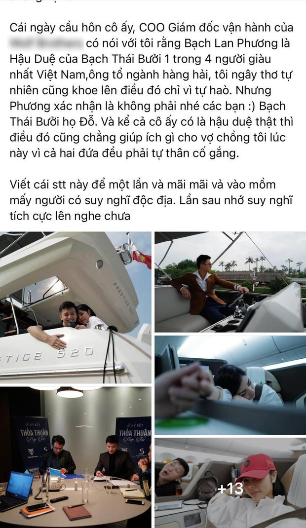 Nói về chuyện bị đồn yêu Bạch Lan Phương vì tiền bạc, Huỳnh Anh cũng có lời đáp trả căng đét: "Chúng tôi yêu nhau cũng chẳng vụ lợi gì. Bạn nghĩ tôi bán du thuyền có thể được lợi gì khi yêu và lấy một cô gái kinh doanh spa? Tại sao tôi không đi yêu đại gia bất động sản? Hay yêu một bà cho vay nặng lãi chẳng hạn?".