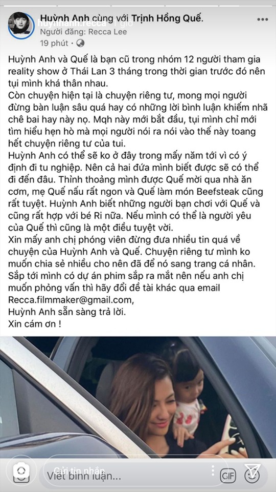 Huỳnh Anh viết: "Huỳnh Anh và Quế là bạn cũ trong nhóm 12 người tham gia reality show ở Thái Lan 3 tháng trong thời gian trước đó nên tụi mình khá thân nhau.
