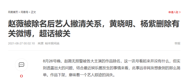 Sự kiện đang "hot hit" nhất của Cbiz trong ngày 26/8 này là việc nàng đại hoa đán Triệu Vy bất ngờ bị phong sát mà không hề có dấu hiệu báo trước nào cả. Giữa tình hình này, Huỳnh Hiểu Minh và Dương Tử gấp rút "chạy nạn" ngay trong đêm, lập tức xóa/ẩn hết những bài viết có liên quan tới nàng "Én nhỏ".