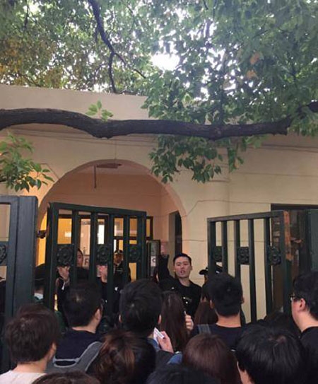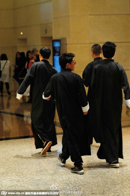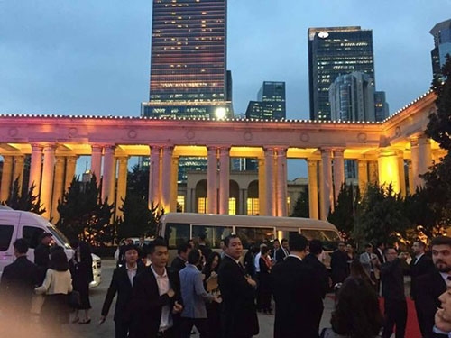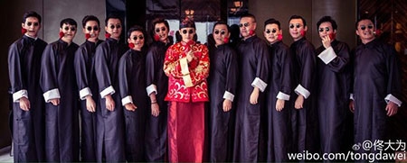 Đoàn phù rể "cool ngầu" trong trang phục "Tân bến Thượng Hải" xuất hiện bên ngoài Trung tâm triển lãm Thượng Hải. Có thể nhìn