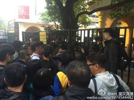 Đám đông phóng viên đang xếp hàng trước địa điểm cưới, chuẩn bị vào lễ đường tác nghiệp.
