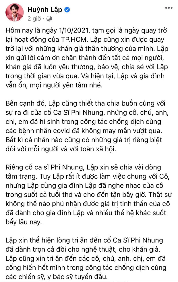 Thời điểm cố ca sĩ Phi Nhung ra đi, Huỳnh Lập đã mở khóa trang Facebook và đăng đàn bày tỏ sự thương tiếc. Anh viết: "Riêng cố ca sĩ Phi Nhung, Lập xin sẻ chia vài dòng tâm trạng. Tuy Lập rất ít được làm việc chung với cô, nhưng Lập cùng gia đình Lập đã nghe nhạc của cô trong suốt cả tuổi thơ và cho đến tận bây giờ.