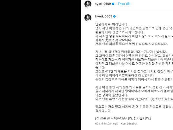 Hyeri đã đăng tải bức tâm thư xin lỗi trên trang cá nhân để nói về chuyện ồn ào liên quan đến bản thân cùng tình cũ Ryu Jun Yeol và Han So Hee trong những ngày vừa qua.