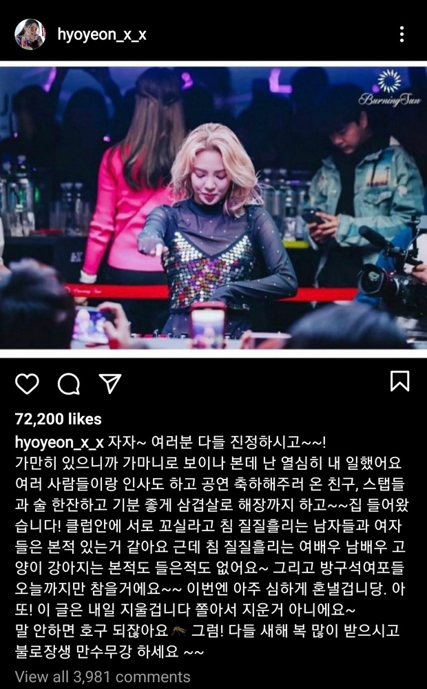 Sau SM, đích thân Hyoyeon cũng đã lên tiếng trên Instagram cá nhân. Cô khẳng định chỉ đến club biểu diễn và không hề nhìn thấy bất kỳ nam, nữ diễn viên nào như trong tin đồn. Đồng thời, nữ ca sĩ cũng tuyên bố có hành động đối với những "anh hùng bàn phím" gây ảnh hưởng xấu đến danh dự của cô.