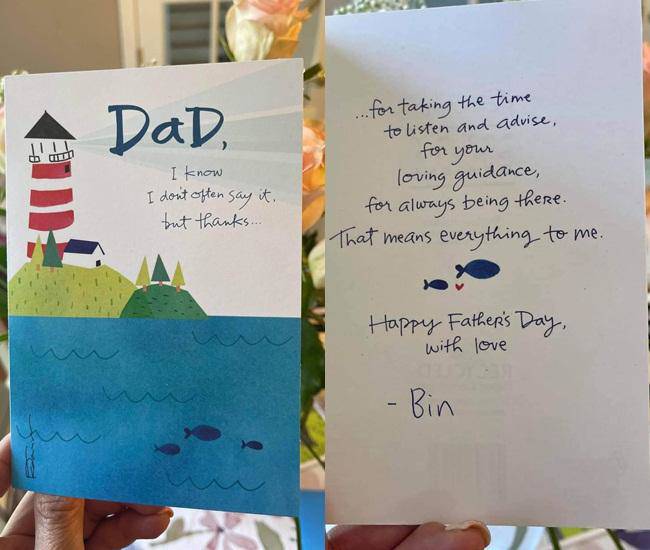 Ít ai biết, ngoài con trai 10 tuổi là con chung với Lệ Quyên, doanh nhân Đức Huy còn có con trai riêng. Mới đây, trên trang cá nhân của mình, chồng cũ Lệ Quyên chia sẻ hình ảnh tấm thiệp gửi từ nước ngoài của con trai cả được gọi là Bin với nội dung chúc mừng Ngày của Cha. Ngoài ra, anh đăng kèm ảnh quý tử cao lớn phổng phao, trông trưởng thành, chững chạc khiến nhiều người bất ngờ. Con trai lớn của Đức Huy có nhiều điểm giống bố, từ vóc dáng cho đến gương mặt.