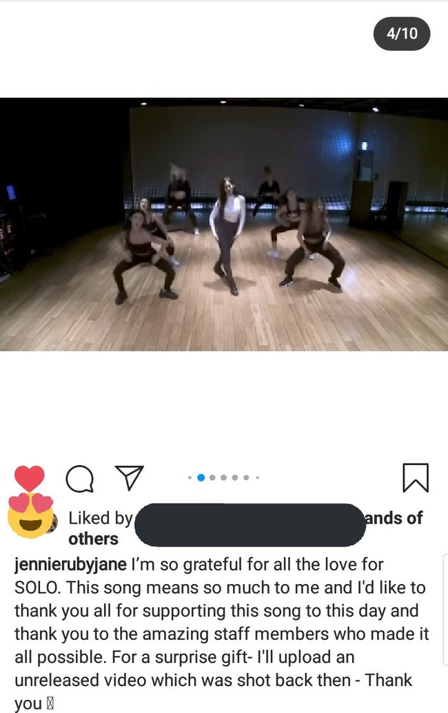 Ngay sau khi biết bản thân vừa đạt thành tích khủng, Jennie liền có động thái "ăn mừng" khi khoe poster MV SOLO đạt 500 triệu lượt xem lên Instagram, đồng thời gửi lời cảm ơn đến người hâm mộ đã ủng hộ cô trong suốt thời gian qua.